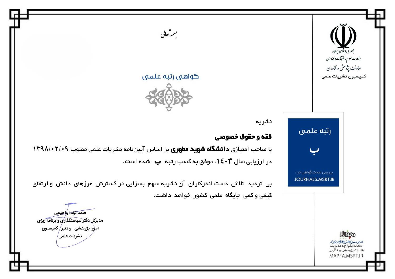 بدینوسیله به اطلاع میرساند که به لطف الهی و همت معاونت پژوهشی و فناوری مدرسهعالی و دانشگاه شهید مطهری، فصلنامه «فقه و حقوق خصوصی» موفق به دریافت درجه علمی پژوهشی و رتبه «ب» از سوی کمیسیون نشریات علمی وزارت علوم، تحقیقات و فناوری شده است. این موفقیت را به همه اساتید محترم و دانشجویان عزیز تبریک عرض مینماییم.